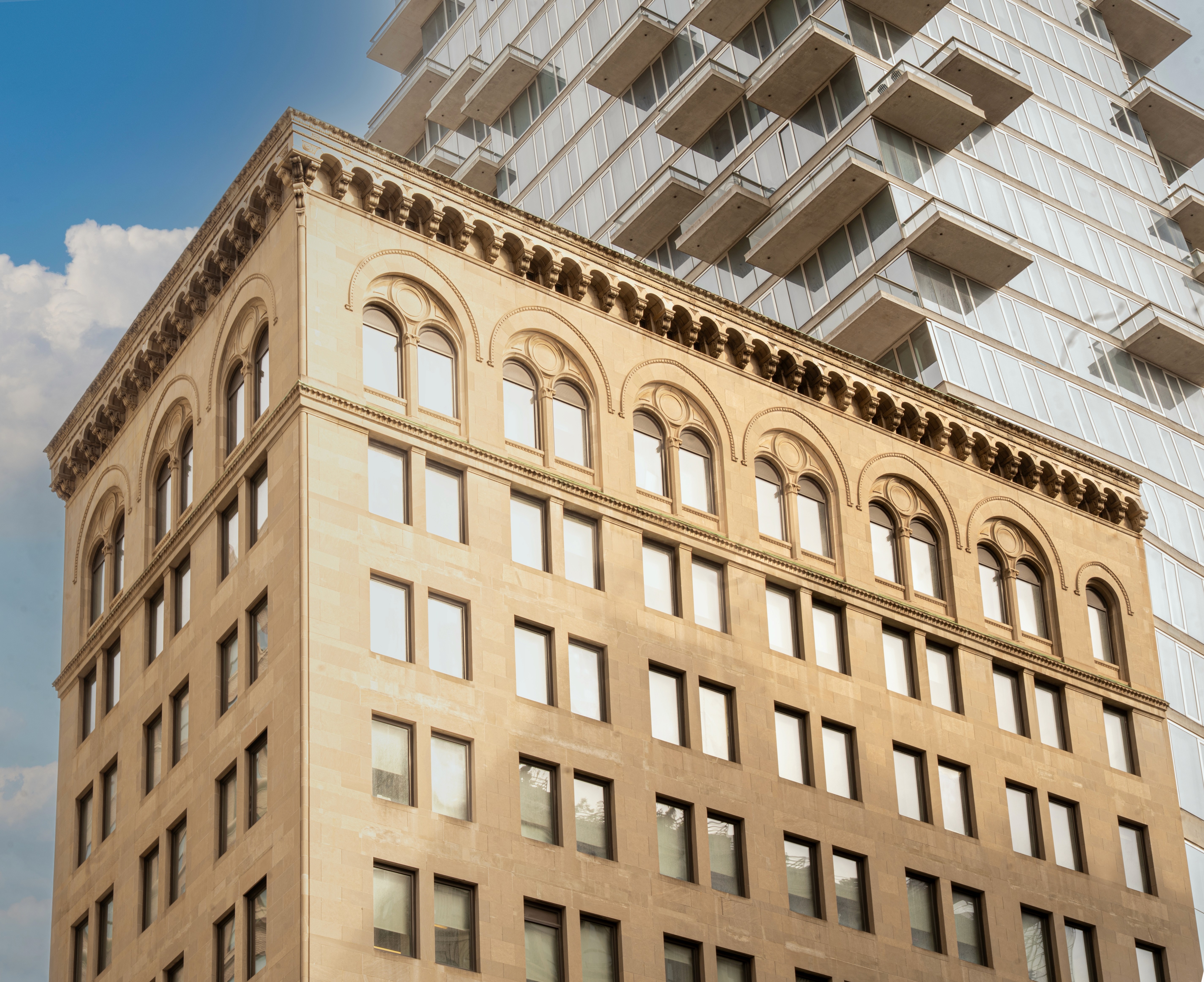 Repointing was performed across all masonry types, including brick, limestone, and terracotta, to reinforce the building envelope and prevent water infiltration. In addition, new railing systems were installed, contributing to both safety and aesthetic improvement.
